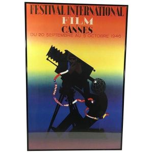 la guerre est finie, l’allemagne est à genoux, les nations libres sont redevenues puissantes avec les accords de yalta et le festival international du film peut enfin commencer. comparée à l’affiche de 1939 (1), réalisée dans des tons sépia représentatifs de l’avant-guerre par le peintre et graveur jean-gabriel domergue, petit-cousin de henri de toulouse-lautrec, les affiches de 1946 (il y en aura trois formats différents) respirent la joie, l’insouciance et la liberté par des couleurs vives et une typographique fantaisie. le grand format (120×160 cm) est signé paul colin (2), le petit (60×40 cm) est signé leblanc et la moins connue (84×63 cm) rémy hétreau.